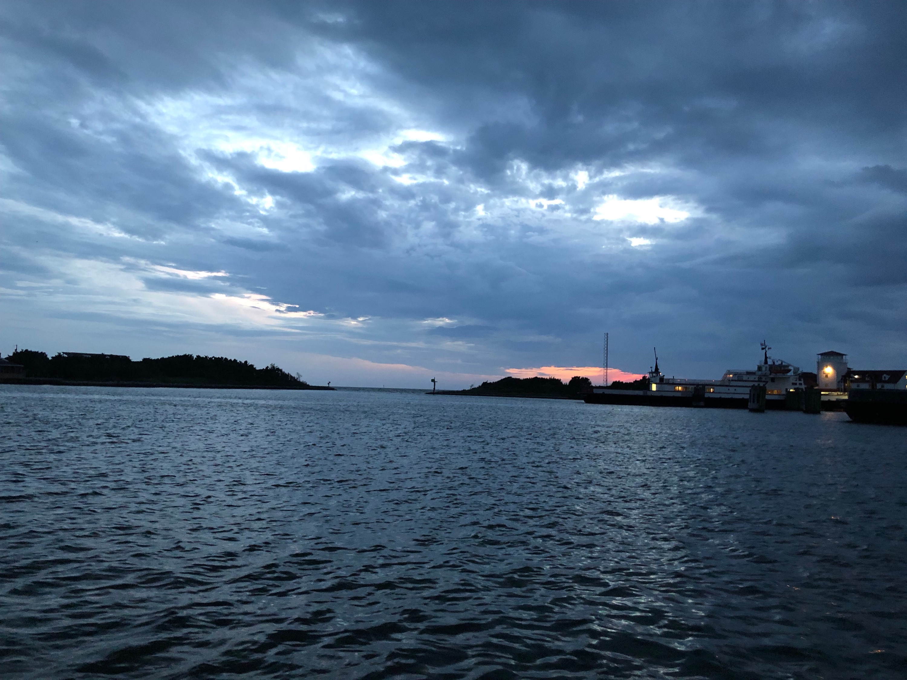 And that’s how that segment ended. Later that evening there was a discussion if we should head to Ocracoke because of the high winds in the afternoon. Was supposed to hit 40kt gusts by 4pm. So we decided that the next morning, 5am, we’d all have our power disconnected and engines running and meet to make the decision. At 5am, we did. Let’s roll. It was already blowing significantly when we left under the cover of darkness before the full sunrise. Got the sails up and we were off again. I had a reef in but the wind lightened up so like the genius I am, fully raised the main. WRONG!!! The wind picked right back up and I was over powered even with letting out the mainsheet. And with all that, I happened to have picked up a crab pot. That is the worst feeling and sound as you hear it thumping on the bottom of the boat, praying that it’s not around the propshaft. Did a few 360’s in each direction to try and free it but no luck. It wasn’t until I hove-to to reef the main that it fell off. Glad it did because the only other option would have been to put on the harness, run the backline and tether in to dive over. In the middle of the Pamlico in 3 to 4ft waves and high winds, to free the pot. Glad it didn’t come to that. But what a fantastic sail over.
